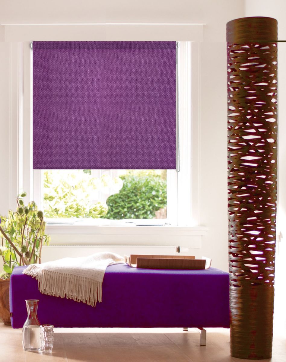 - Для создания яркого контраста в комнате, можно использовать белые ролеты и фиолетовый тюль в пол.