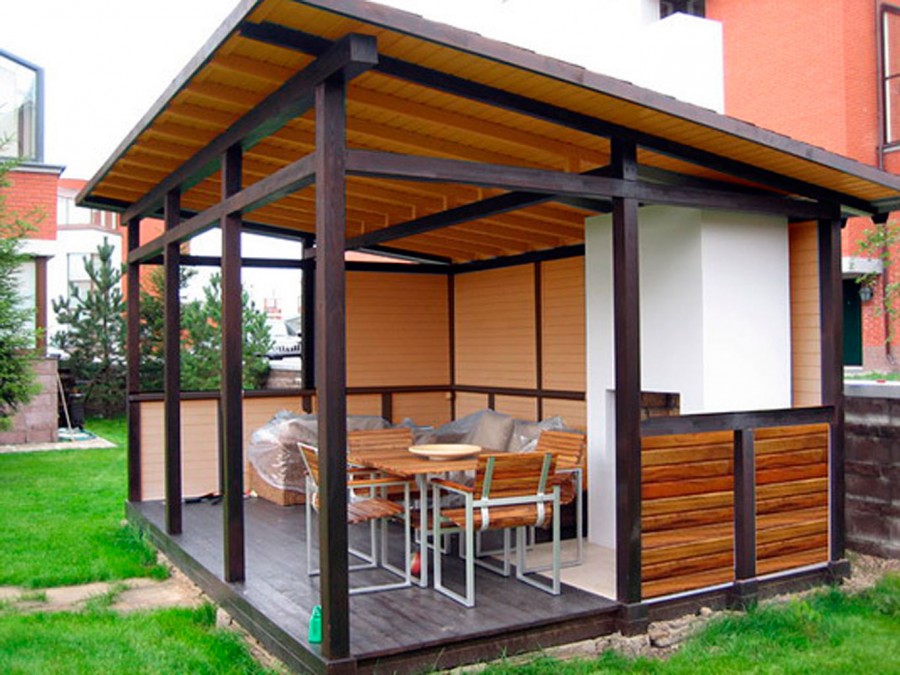 - Минимализм — беседки в виде параллелепипеда с плоской крышей из современных материалов, например, из поликарбоната.