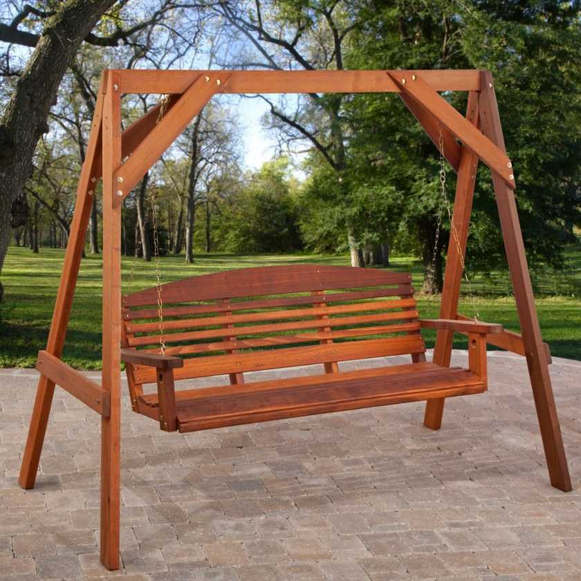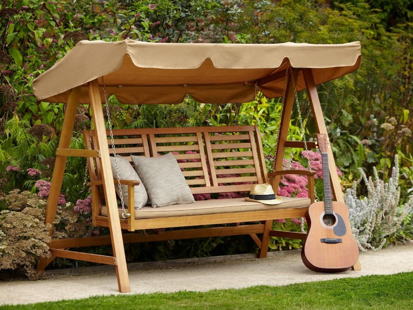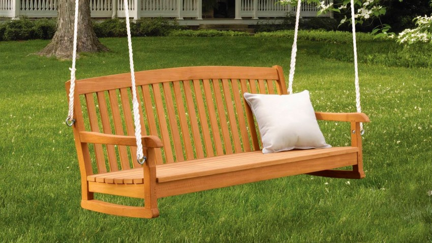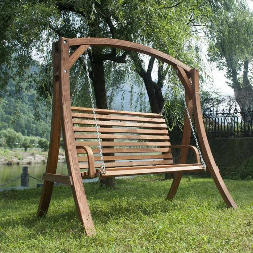 - Привлекательный внешний вид. Лаконичные деревянные качели гармонично будут смотреться на любом приусадебном участке.