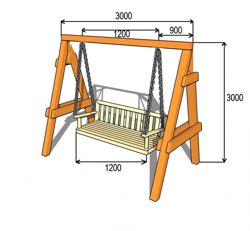 С методом соединения разобрались, теперь стоит приступить к чертежам. Нужно определить, сколько мест будет предусмотрено на качели. Оптимальный вариант – 3. Для трехместной качели будет достаточно ширины сидения 150 – 160 см. Тогда прибавляем минимум 40 см зазора между сидением и опорами – по 20 см с каждой стороны и получаем ширину качели 200 см.