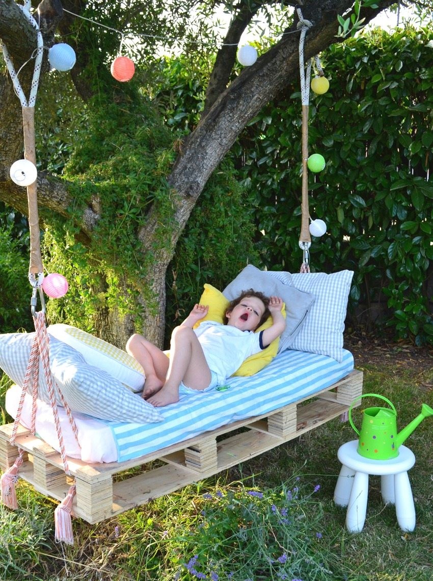 Помимо древесины и металла, не следует забывать и о поддонах, из которых также можно изготовить садовые качели. Они являются универсальным материалом, поэтому сделать из них подобные конструкции особого труда не составит. Для работы также понадобится верёвка и дерево, к которому будет подвешиваться конструкция.