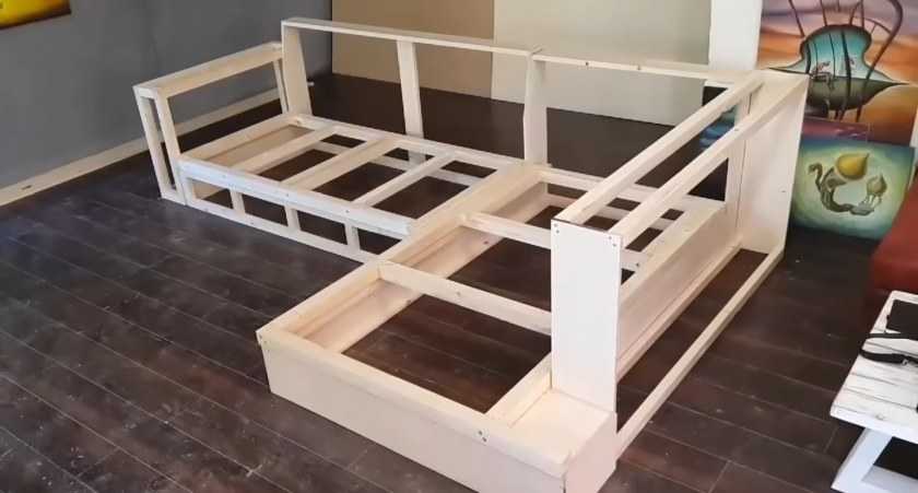 Мягкая мебель стандартного типа состоит из двух блоков – спинки и сиденья. В разложенном виде эти составляющие образуют спальное место. Угловой диван из фанеры – это конструкция из трех модулей, соединенных между собой в виде буквы Г (реже – П). Мебель стоит на четырех ножках, в некоторых моделях вместо них применяются ролики.