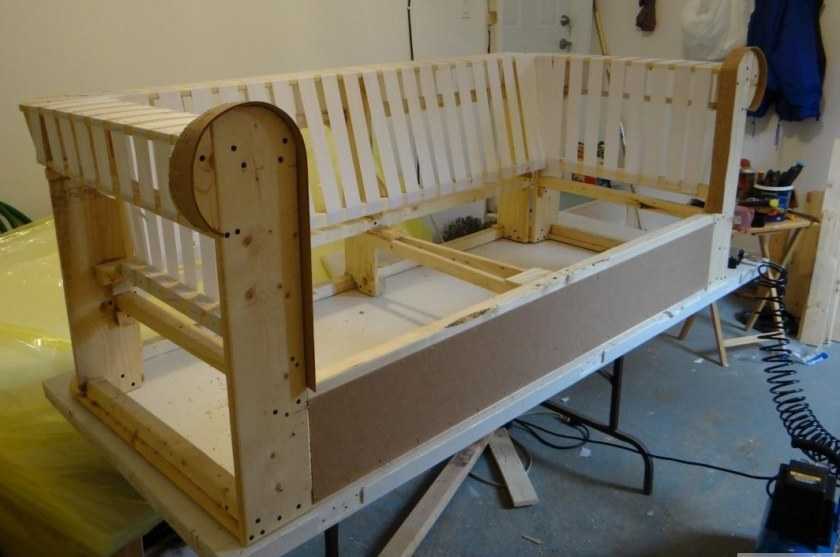 - Далее основание и спинка изделия обшиваются деревянными планками. Планки должны быть прочными, чтобы смогли выдержать вес взрослого человека.