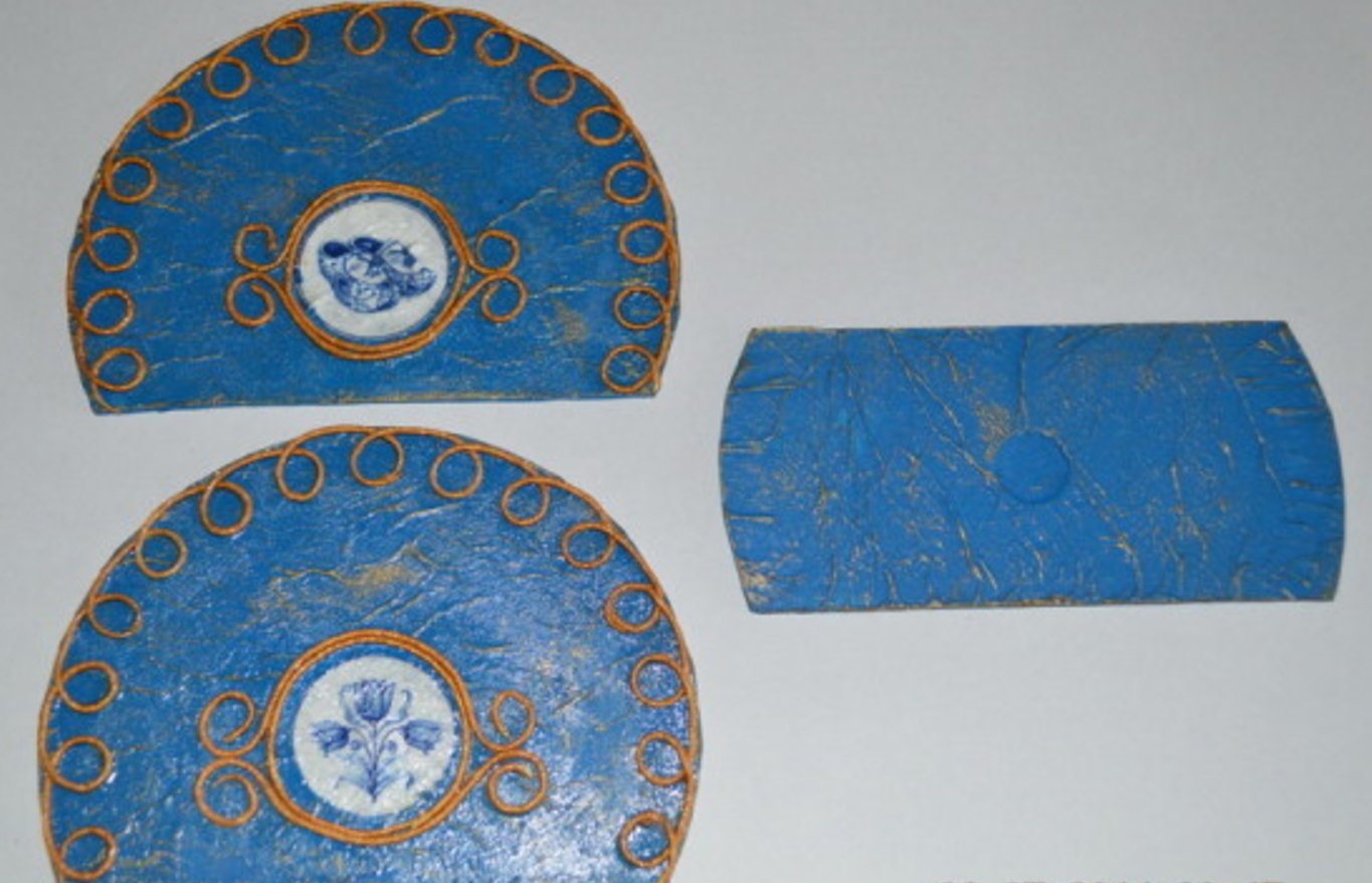 - После этого изделие хорошо промазывается клеевым составом либо бесцветным лаком. Затем из 4-х газетных заготовок формируют 2 двойные детали, их приклеивают на том расстоянии, где будет размещаться край салфетницы. Им оборачивают заготовку. Все это присоединяется друг к другу.