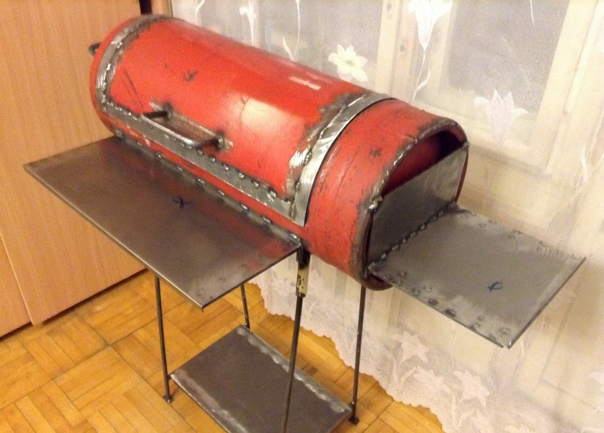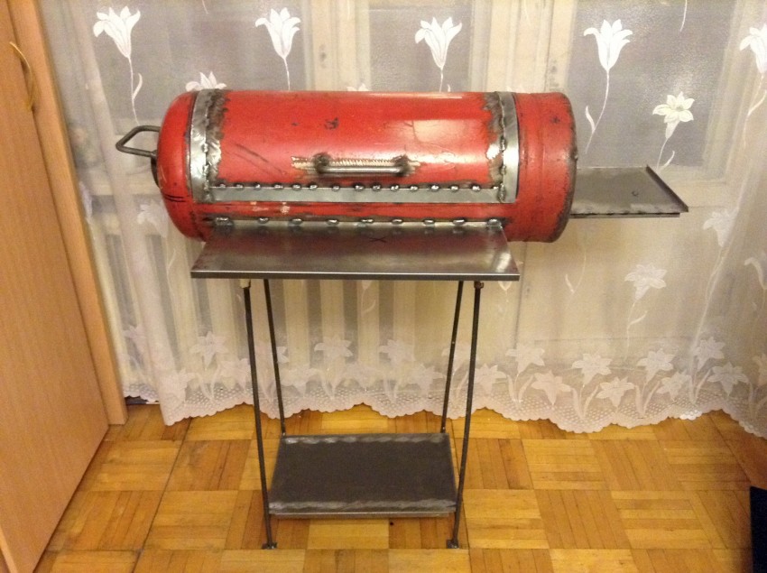 К коптильне приварили ножки и столик, на который можно будет поставить посуду с приготовленными к копчению продуктами. Внутри установим решетку от старого холодильника, согнув ее по размерам баллона.