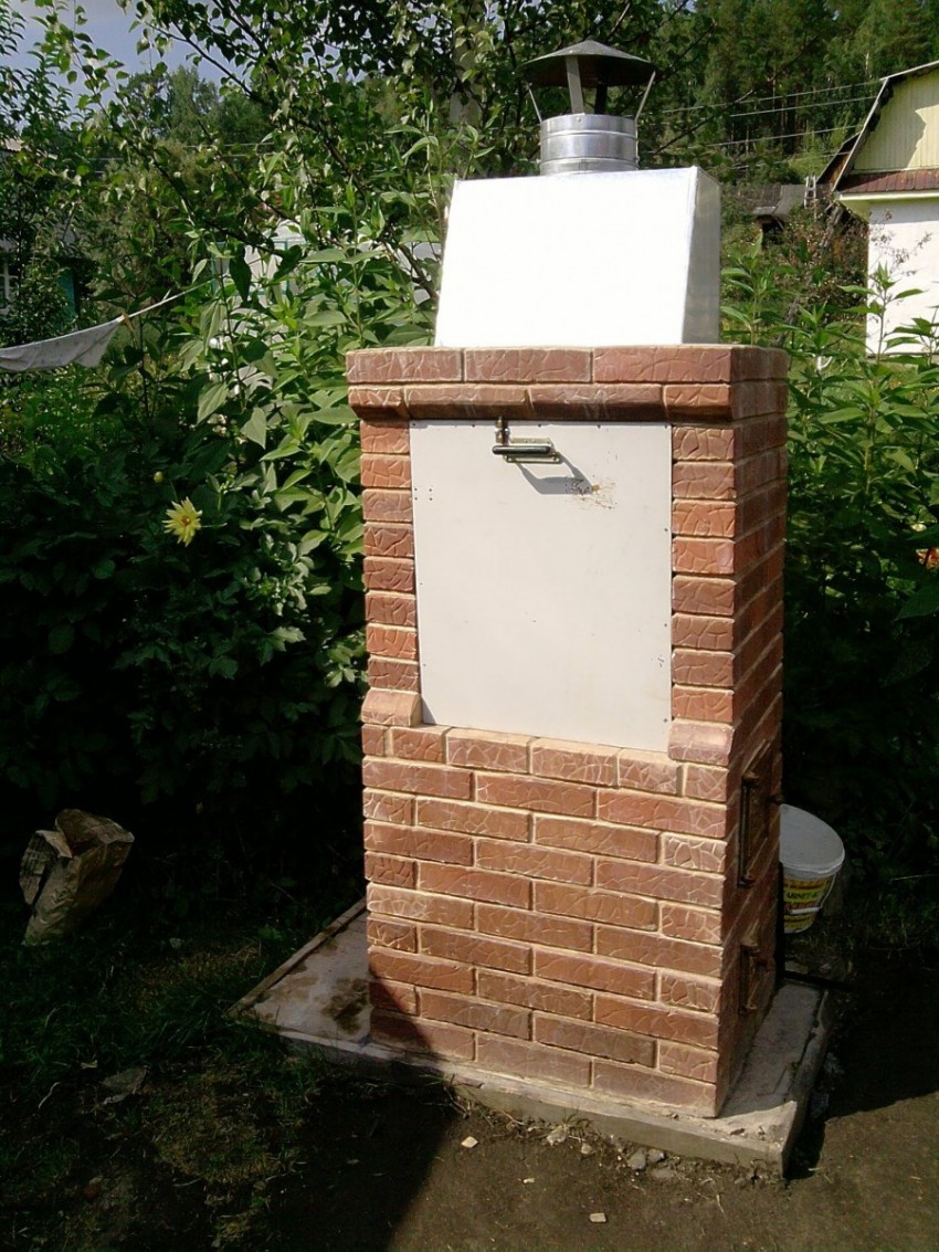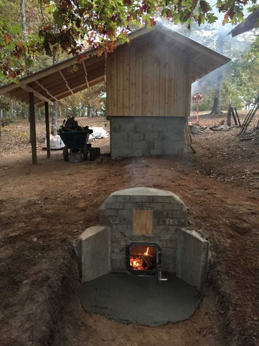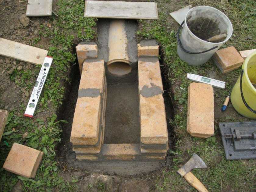 Дверку на топку нужно изготовить чугунную и надежно закрывающуюся. Ее основание делают из кирпича, а стены выводят немного вверх над землей. Затем на него ставится деревянная конструкция. Траншею, где находится дымоходная труба, засыпают землей, а затем хорошо трамбуют. Это необходимо для того, чтобы труба и дым охладились.