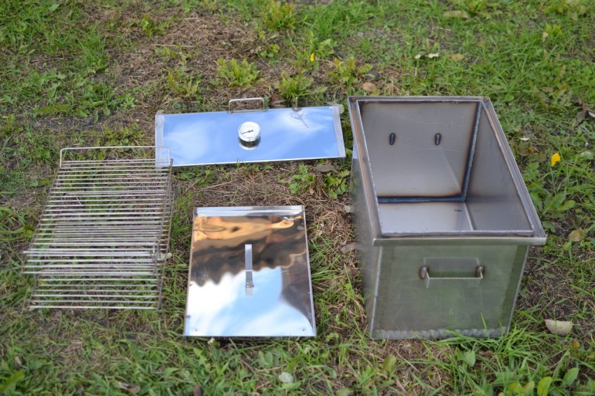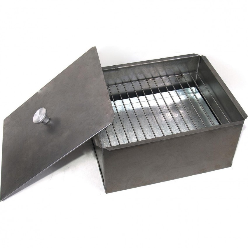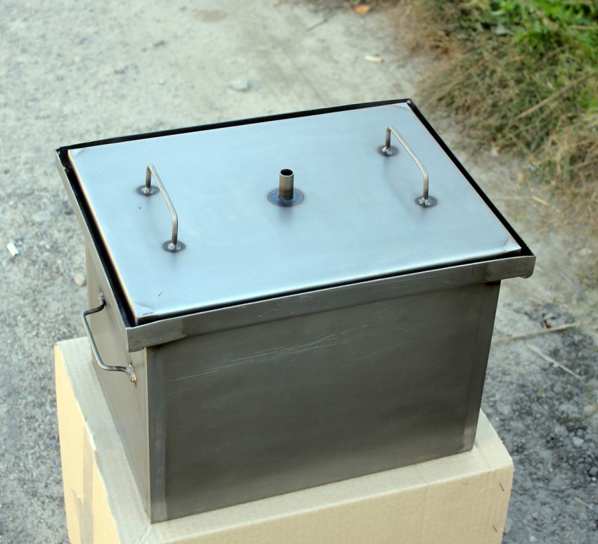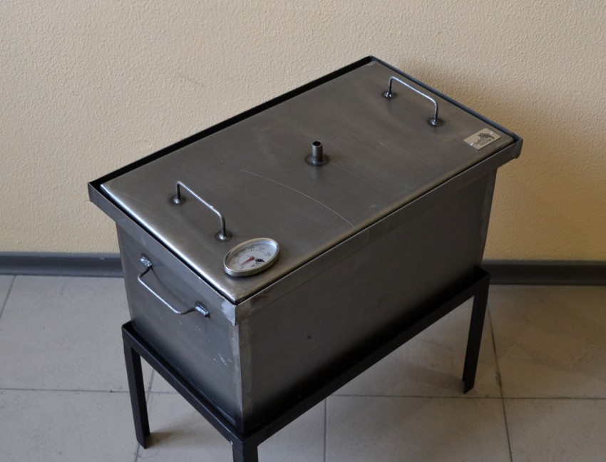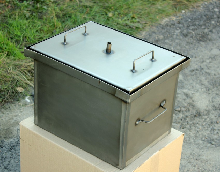 Чтобы сделать надежную коптильную камеру, выберите прочный металл – нержавеющую сталь. С виду такая конструкция похожа на короб. Во внутренней части приваривают уголки для двух металлических решеток.