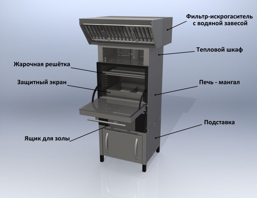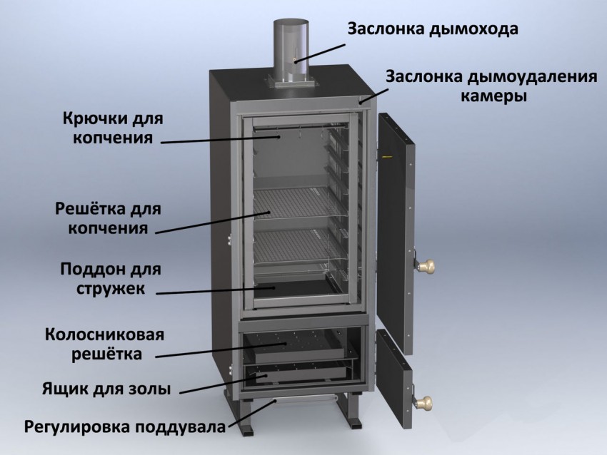 Топки. Размещается под камерой и играет роль нагревательного элемента;Герметичного отсека (коптильни). Этот элемент обеспечивает хорошее прогревание продуктов и поддерживании заданного температурного режима;Гидрозатвора. Его рекомендовано устанавливать, так как затвор помогает снижать уровень канцерогенных составляющих в дыме и регулирует воздухопотоки;Решетки. Для выкладки продуктов;Съемного поддона.сборщика растопленного жира, выделяющегося при приготовлении.