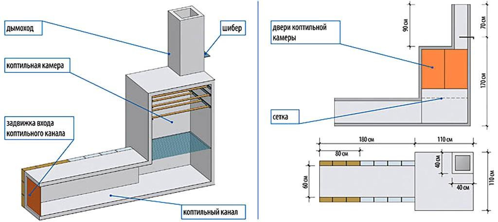 Данные модификации сооружаются по основному закону – дым, прежде, чем достигнуть продуктов, обязан остыть. Эти модели имеют любые типоразмеры и состоят из следующих частей: