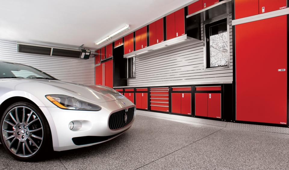 просторный гараж обустроен подвесной мебелью и автоматическими воротами