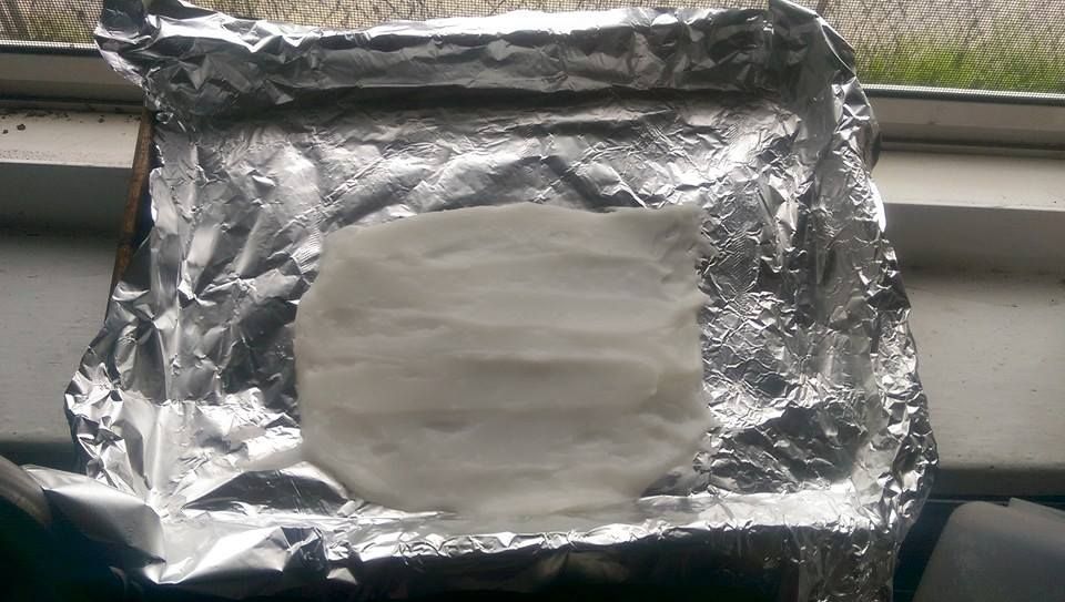 Как только вы выложите смесь на противень, она будет похожа по консистенции на гель для волос, и ей нужно будет остыть перед тем, как можно будет придать ей форму. Дайте ей полежать около минуты, затем распределите шпателем по фольге. Следующие 15 минут пластик будет затвердевать, и не будет прилипать к пальцам при прикосновении, но при этом будет всё еще будет. Для полного затвердевания пластику нужно дать постоять в течение нескольких часов.
