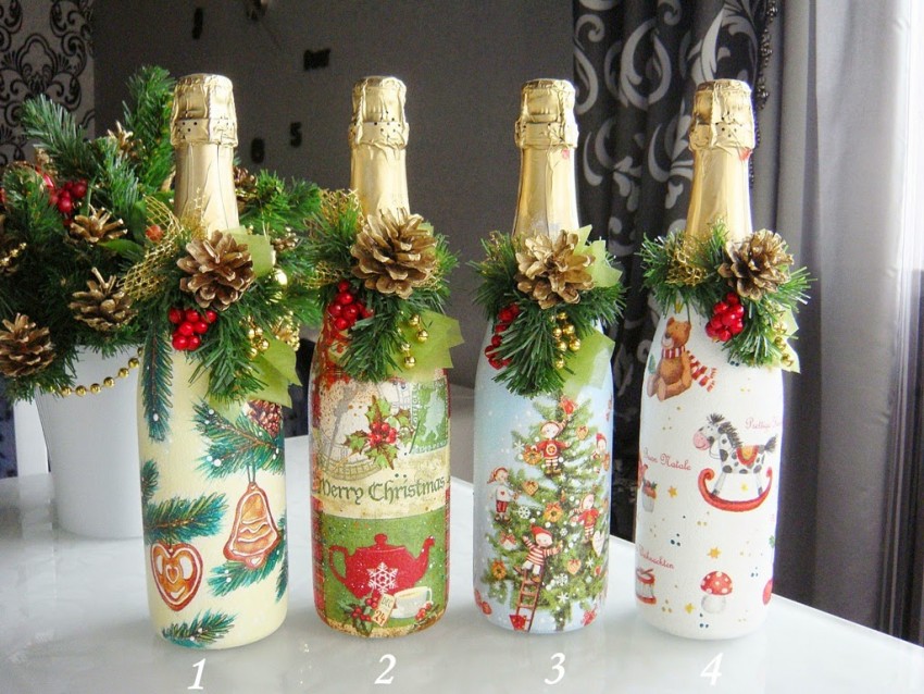 Также пользуется огромной популярностью сейчас такой вариант украшения емкостей, как декупаж. Это можно обосновать тем, что он сочетает в себе простоту и отличный результат. Такой метод применяют не только для украшения бутылок, но и чтобы оформлять бокалы молодоженов. В целом, это очень простая технология: