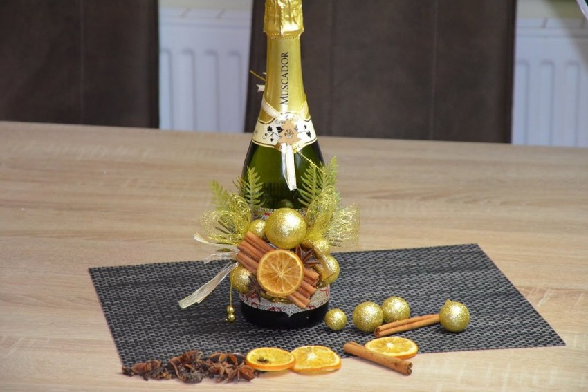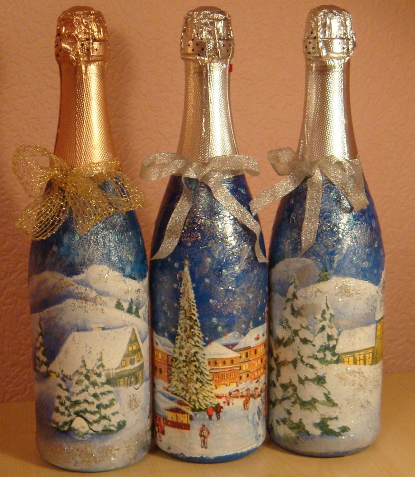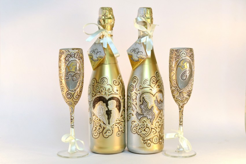 Вариантов оформления масса – украшение объемными элементами, тканями и кружевом, жемчужинами, скрапбукинг, лепка. Неплохо смотрится напиток в бутылках, расписанных акриловыми красками вручную.