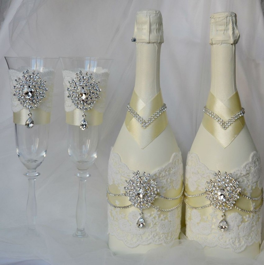 Шампанское – самый традиционный напиток для свадебного гуляния, им изобилует любой праздничный стол. Во многих свадебных конкурсах и играх также используются бутылки с этим напитком. Это весомый повод сделать шампанское небольшой изюминкой праздника. В настоящий эксклюзив можно превратить бутылки, проявив немного фантазии и смекалки. Выполнить декорирование возможно своими силами, что сэкономит денежные средства.
