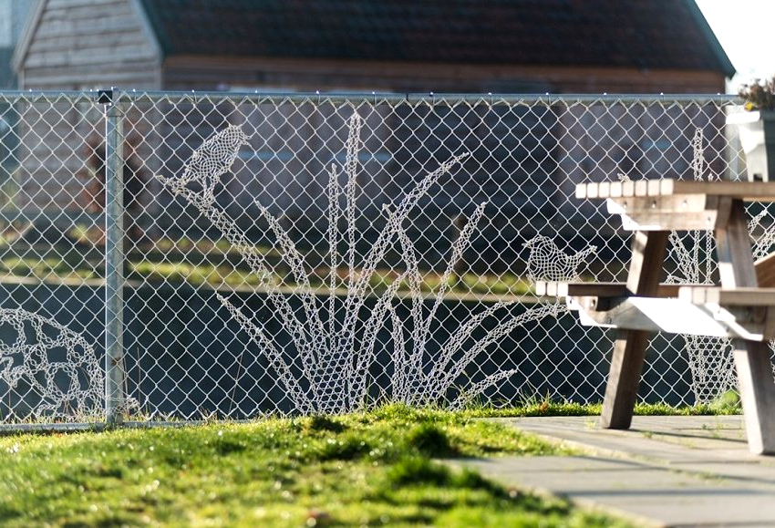 Обычный забор из сетки рабицы также может быть весьма оригинальным