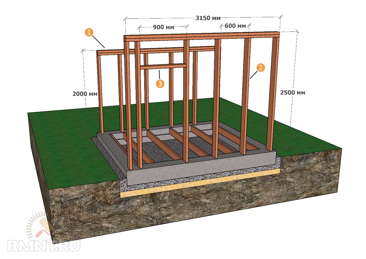 Каркас передней и задней стенки сарая: 1 — задняя стенка сарая (лучше использовать сдвоенные доски или брус большей толщины для усиления стенки, с учётом дополнительной нагрузки от полок и стеллажей); 2 — передняя стенка сарая; 3 — дверной проём