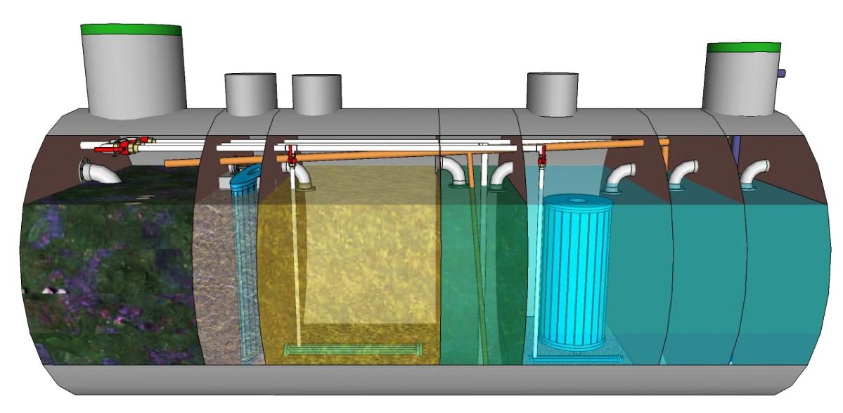Стандартная модель состоит из четырех секций: непосредственно отстойника, камеры для расщепления грубых отходов с анаэробными бактериями, сепаратора с микроорганизмами, аэробного септика, играющего роль дренажного поля.