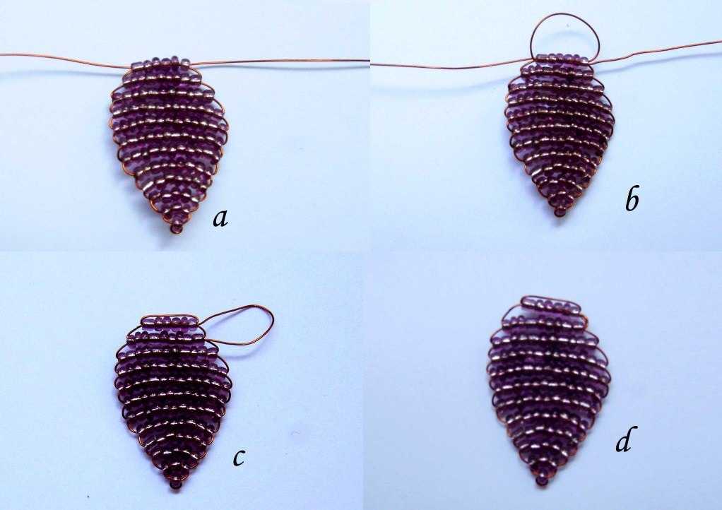2) Следующие действия будут направленны на уменьшение количества бусинок в каждом слое. Мы закончили на тринадцати и новый будет иметь в своем составе только девять, а после него ряд в шесть бусинок — этот будет последним. Такое разное количество элементов по рядам позволит нам создать обтекаемость и плавность форм, что улучшит вид фигурки. То что мы получили — это одна половинка нашего сердца, которая с виду очень похожа на листочек. Остатки проволоки (или лески) нужно обрезать и аккуратно спрятать, как это показано на рисунке.