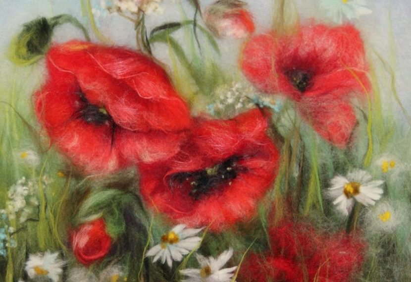 Маки выполненные методом послойного выкладывания цветной овечьей шерсти