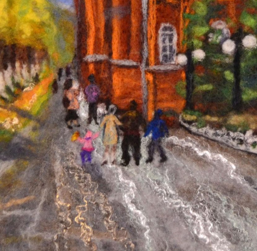 Сугробы сделать с помощью белых прядей, уложенных параллельно горизонту. Такой прием можно увидеть, рассматривая пейзажи из шерсти.