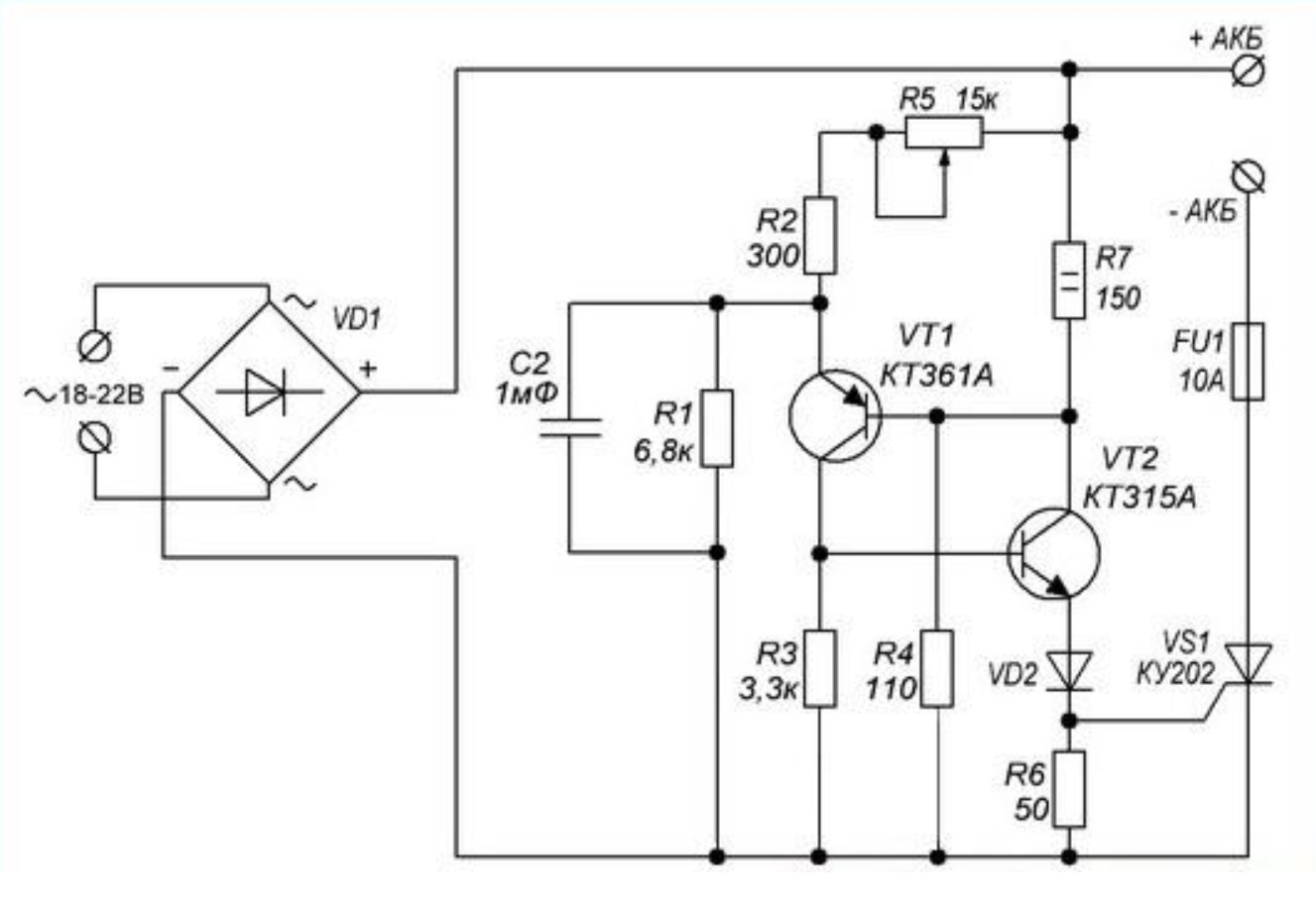Перед вами фазоимпульсный регулятор, где главными элементами являются тиристоры. Под текстом – доступная схема зарядного устройства для автомобильного аккумулятора: