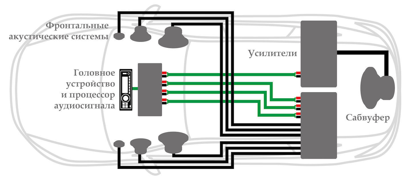 Уже на этом этапе оцените, что будет являться источником в системе. Если головное устройство с обычными линейными выходами, то тут проблем никаких. Если же вы имеете дело со штатной «головой», то тут почти всегда приходится искать обходные манёвры. Я уже рассматривал эту тему подробнее в статье «Звук в автомобиле: как заставить штатную систему звучать лучше», сейчас отмечу лишь то, что касается подключения усилителей.