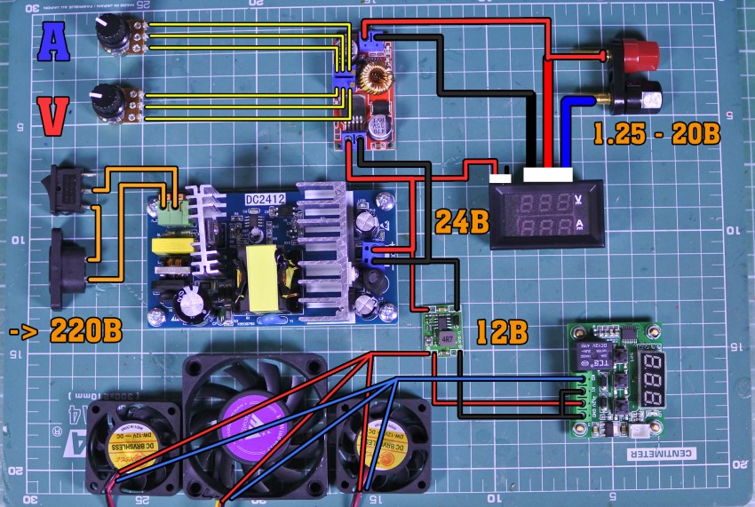 - для контроля напряжения на выходе устанавливают цифровой вольтамперметр, с интервалом измерений от 1,5 до 30 В.