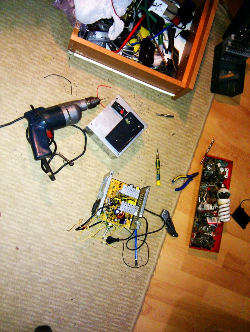 Так как наш блок будет включаться и выключаться, то ему так же необходим включатель, его я разместил рядом с штекером под вилку. Проделываем под включатель место, тут главное не переборщить, тогда он просто будет болтаться, что не очень хорошо.