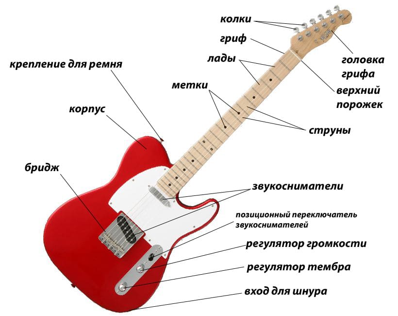 Электрическая гитара должна состоять из элементов, отличающих ее от акустической родственницы. Это следующие части электрогитары: