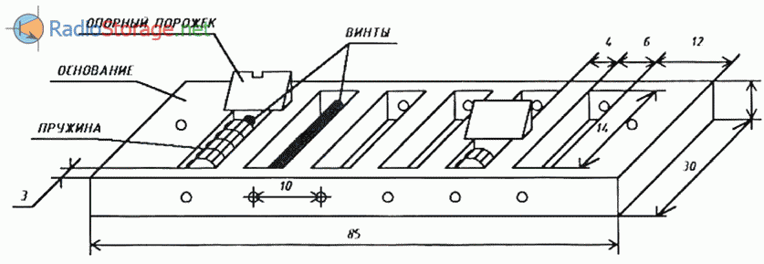 Струнодержатель представляет собой параллелепипед с шестью сквозными отверстиями диаметром 1,5…2 мм для протяжки струн. С одной из сторон эти отверстия надо раззенковать сверлом диаметром 5 мм на половину глубины (ширины струнодержателя).