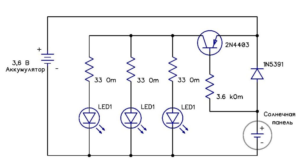 Принцип действия предложенной цепи прост. Когда солнечный свет падает на панель, транзистор закрыт, и энергия накапливается на аккумуляторе. Когда на солнечную панель перестает попадать свет, транзистор открывается, и ток идет на светодиоды. Таким образом, в течение светового дня светильник заряжается, а вечером и ночью он светится. Для заряда хватает восьми часов, а время работы зависит от емкости аккумулятора и силы свечения светодиодов.