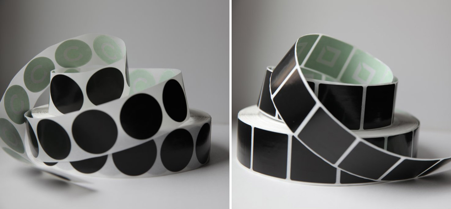Метки для электромагнитных систем включают несколько полосок на наклейке из бумаги. Одна из полосок обладает магнитострикционным эффектом. Когда она оказывается в магнитном поле, получает свойства нелинейного элемента. В результате в магнитном поле появляются гармоники рабочих частот.