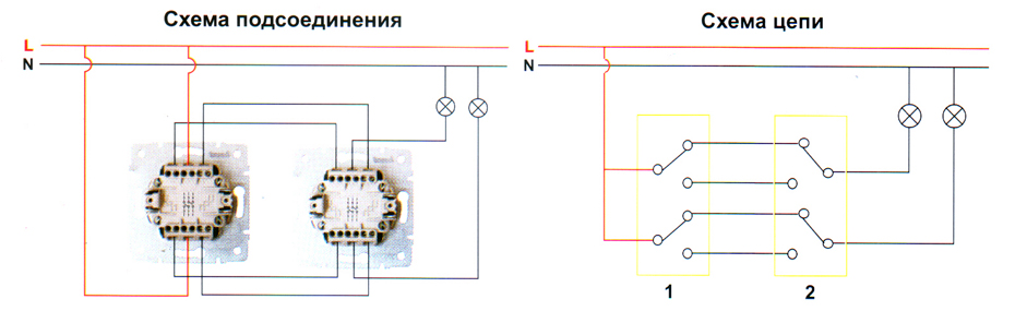 Двухклавишные проходные выключатели из 2-х мест. Схема подключения