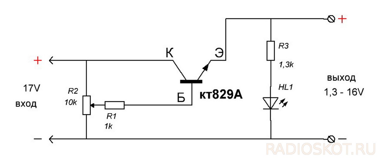 Имелся стабилизированный импульсный блок питания, дающий на выходе напряжение 17 вольт и ток 500 миллиампер. Требовалось периодическое изменение напряжения в пределе 11 – 13 вольт. И общеизвестная схема регулятора напряжения на одном транзисторе с этим прекрасно справлялась. От себя добавил к ней только светодиод индикации да ограничительный резистор. К слову, светодиод здесь это не только «светлячок» сигнализирующий о наличии выходного напряжения. При правильно подобранном номинале ограничительного резистора, даже небольшое изменение выходного напряжения отражается на яркости свечения светодиода, что даёт дополнительную информацию о его повышении или понижении. Напряжение на выходе можно было изменять от 1,3 до 16 вольт.