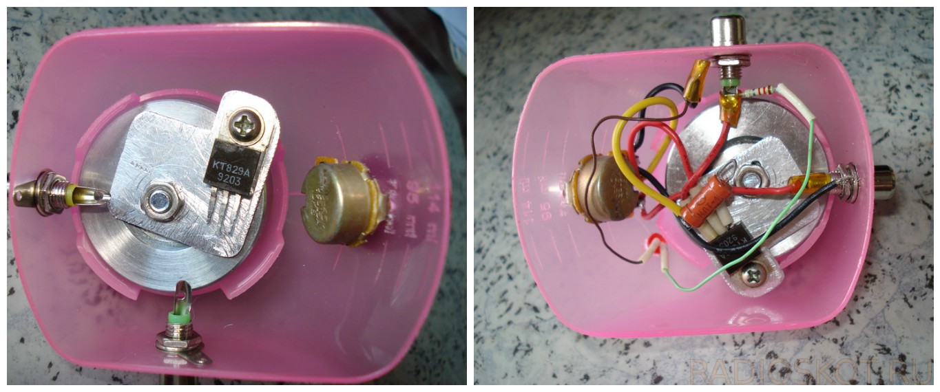 Для предотвращения продавливания стенки радиатора в месте крепления симистора, под головку винта была подложена шайба. А у самого винта была сточена большая часть шляпки, чтобы последняя не цеплялась за ручку потенциометра, регулятора мощности.