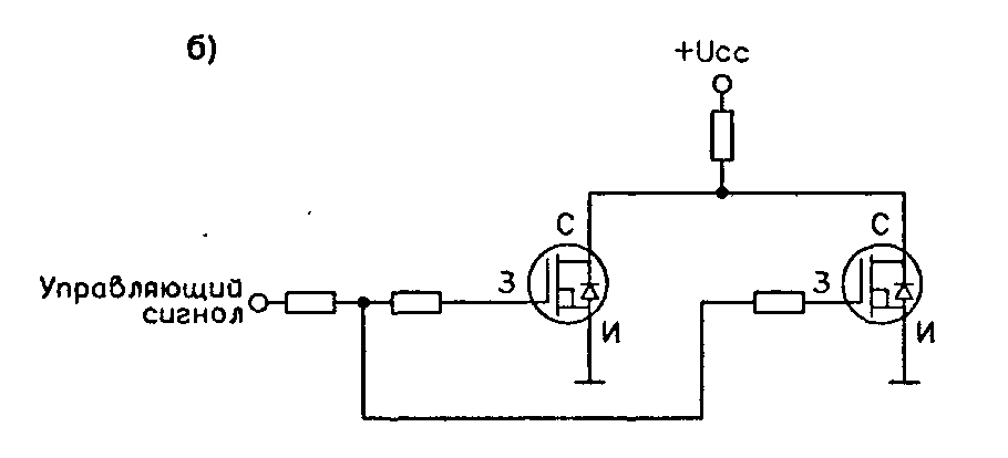 Надо отметить, что если Ес < Uзи.порог1 + Uзи.порог2, то при изменении входного сигнала не возникает ситуация, когда оба транзистора включены. Но если данное неравенство не выполняется, то такая ситуация будет иметь место при некотором промежуточном напряжении uвх, и тогда через транзисторы протекает так называемый сквозной ток.