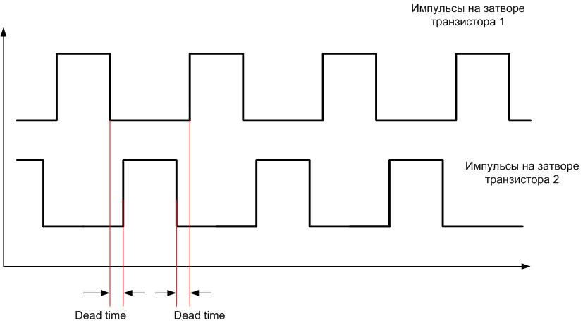 Пуш-пульный инвертор (push – толкать, pull – тянуть) — пример двухтактного преобразователя. Транзисторные ключи работают на первичную обмотку трансформатора, состоящую из двух полуобмоток I и II. Транзисторы поочередно открываются на заданный промежуток времени. Когда открыт верхний по схеме транзистор, ток течет через полуобмотку I (красная стрелка), когда второй – через полуобмотку II (зеленая). Чтобы избежать ситуации, когда оба ключа открыты (из-за конечной скорости работы транзисторов), схема управления формирует паузу, называемую Dead time.