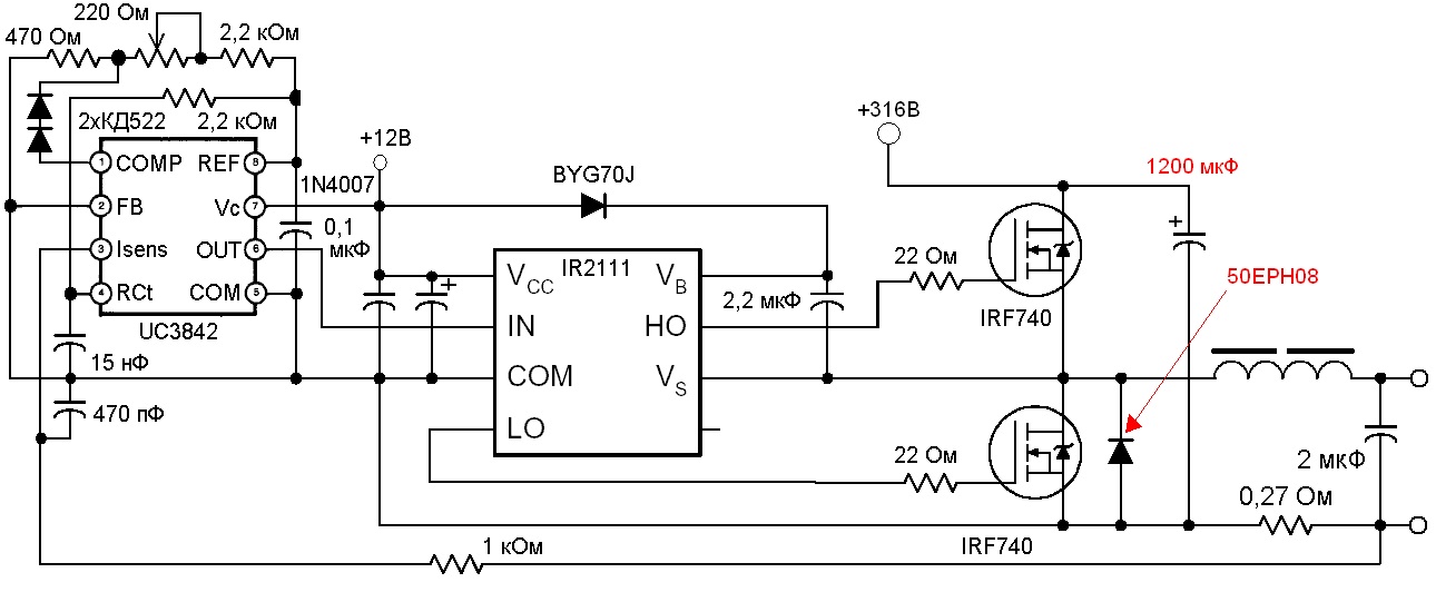 - в отличие от пушпульной отсутствуют выбросы напряжения;