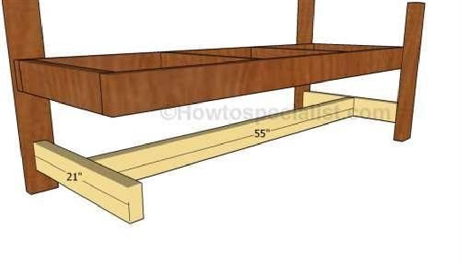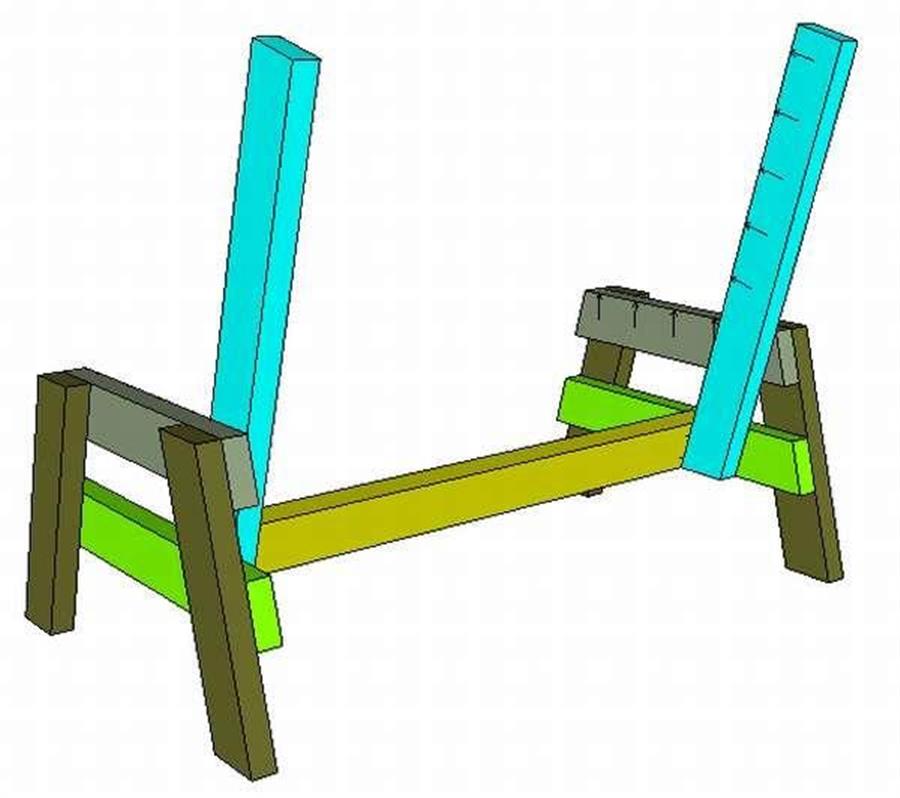 Полученные ножки соединяем двумя строганными досками. Одна из них сечением 40х140 имеет длину 188 см, вторая сечением 25х80 длиной 180 см. Первая рейка крепится в предварительно пропиленные пазы в передних ножках, вторая торцом к задним опорам.
