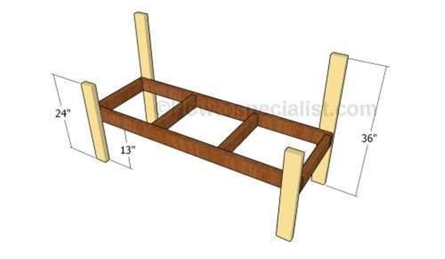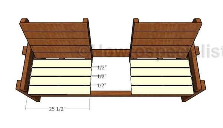 Сиденье можно изготовить, прикрутив две детали (118 * 12 см) к основаниям, используя саморезы. Из-за малой толщины досок есть определённый риск, касающийся того, что доски могут лопнуть. Чтобы это не случилось, следует просверлить отверстия в местах соединения. Это рекомендуется сделать до закручивания саморезов. После того, как была собрана первая скамейка, следует выполнить замеры. Внутренняя ширина должна составлять 114 см, а наружная 116.