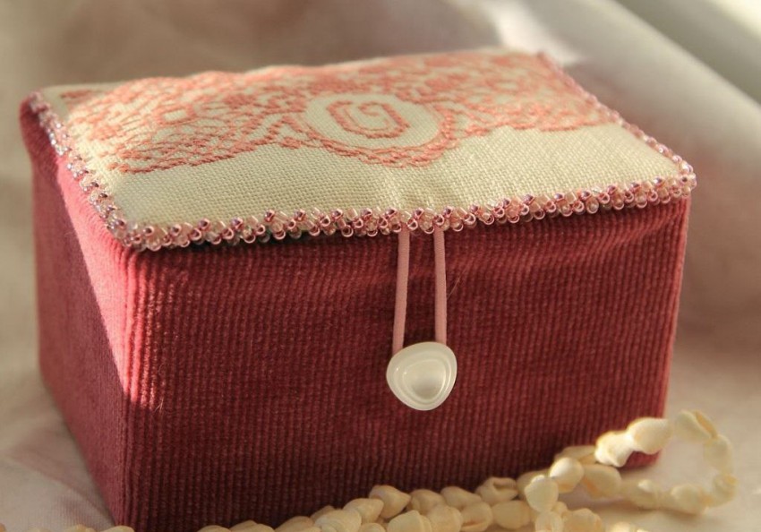 Декорируем шкатулку кружевом, бусинами, толстой нитью и другими элементами.