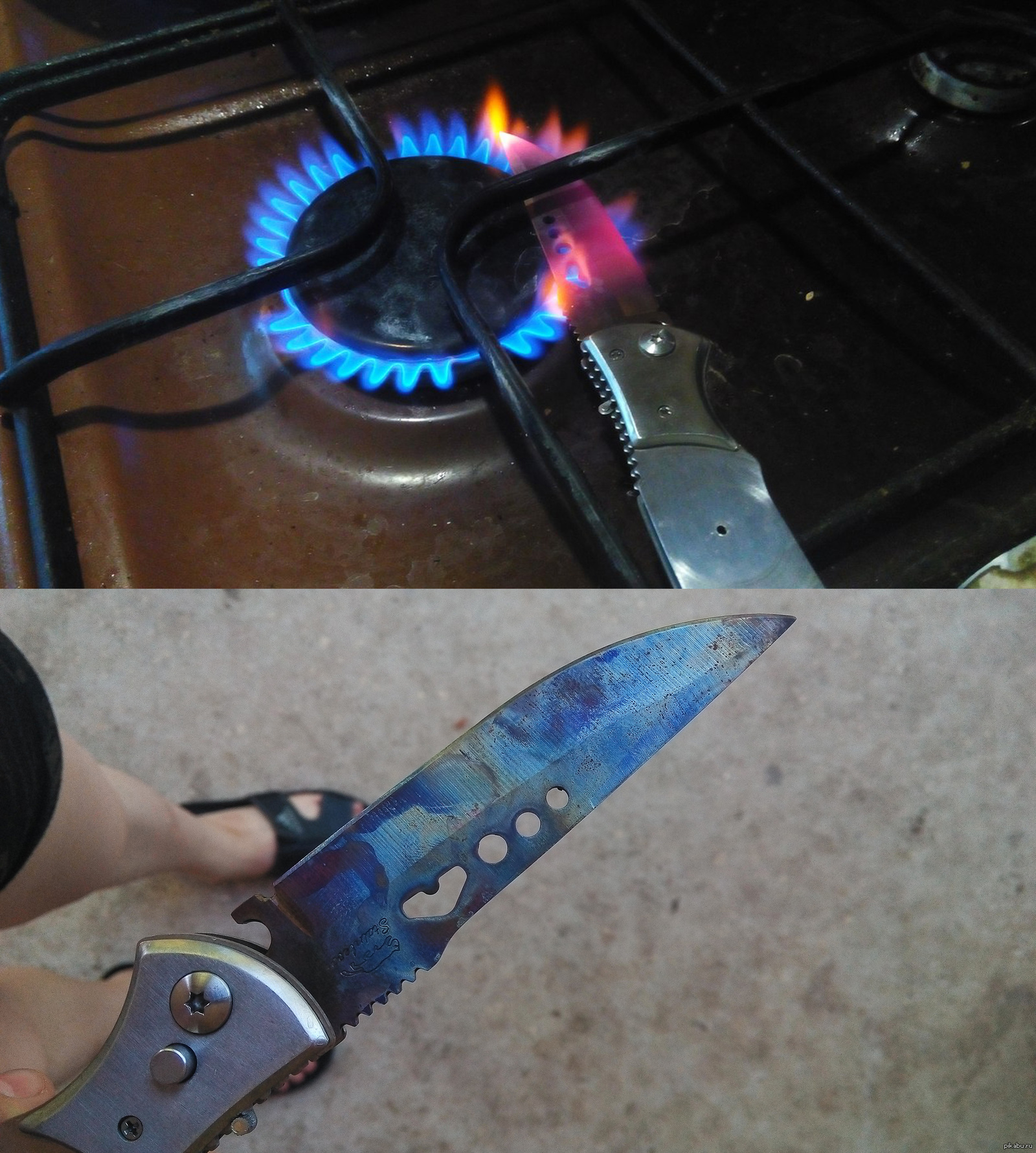 Закаливать нужно только лезвие, металлический каркас рукоятки ножа в этом не нуждается. Данная процедура позволит изделию долго держать заточку, иметь гибкость, при этом быть очень прочным. Поскольку лезвие ножа представляет собой небольшую металлическую пластину, для его разогрева не нужен кузнечный горн, а подойдет обычная газовая или керосиновая горелка. Профессиональный подход предполагает измерение температуры нагрева, а также доведение её до уровня, необходимого для конкретного вида стали. Обладая необходимым оборудованием, всю нужную информацию по используемой марке стали можно найти в интернете или учебниках – существуют специальные таблицы, где указаны температуры закалки и отпуска.