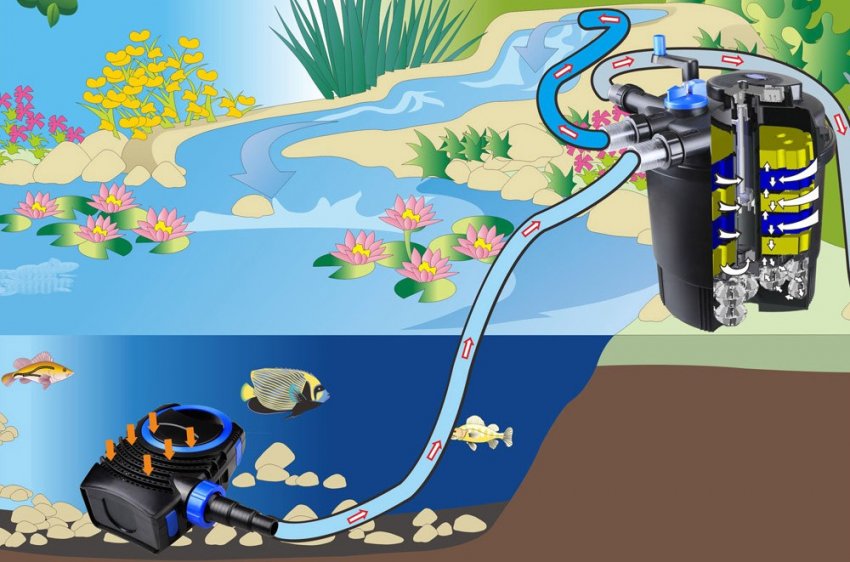 Важно! Существуют фильтры, которые сочетают в себе несколько видов очистки (химическую, биологическую, механическую). Они называются комбинированными.. Подаётся она туда специальным насосом и проходит несколько этапов чистки, а затем самотёком выливается в пруд