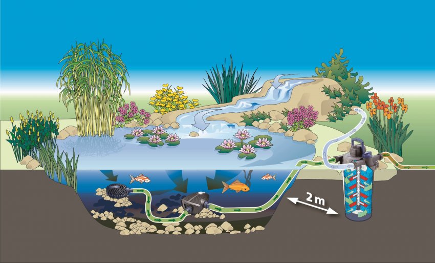 Если водоем вмещает до 5-8 кубометров воды, вам потребуется более производительная очистная система.