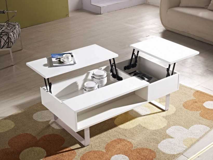 - раскладные журнальные столики, располагающиеся в гостиной. Благодаря данного рода столам легко объединить обеденную и гостиную зоны, сохранив функциональность помещения. Недостатками такого стола можно считать большой вес и высокую стоимость. Как правило, в качестве раскладной системы используется механизм, превышающий общую стоимость материалов в несколько раз;