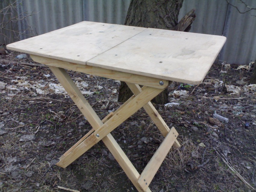 - раскладные походные столики для выездов за город, пикников, дачных мероприятий. Основная черта данных конфигураций – простота сборки, малый вес и портативность. За основу для таких столов выбирается прочная, но лёгкая основа (например, алюминий) и фанера;