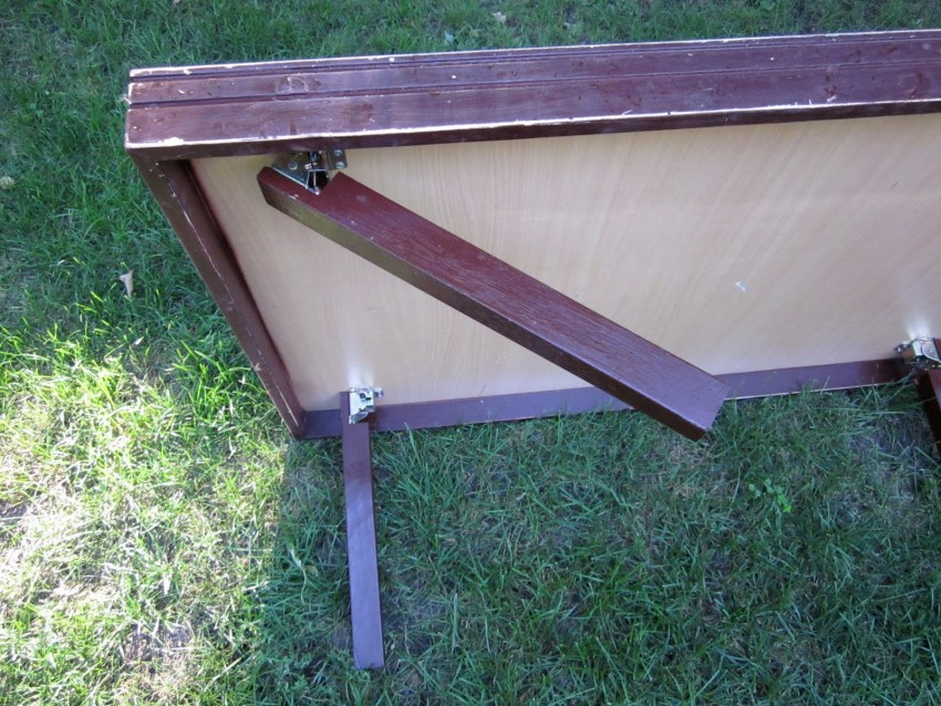 Если конструкция откидывания ножек планируется на петлях или шарнирах, то здесь варианты другие. Но сначала нужно решить, из чего эту систему делать – из дерева или металла. Красивый вариант получается при комбинировании материалов – деревянная столешница и металлические ножки.