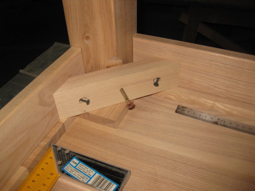 Затем столешница прикручивается к лавке. Для этого используют 2 доски размером 4х10 см. С 1-й стороны упора делают срез под углом в 115 град. Сделав отступ от края столешницы в 14 см, крепят упоры.