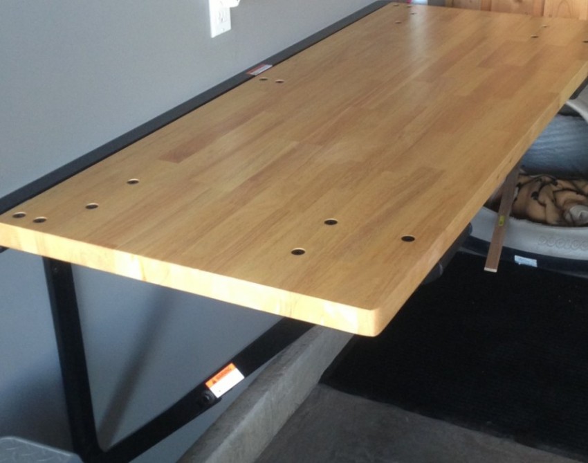 Для столешницы лучше всего использовать два листа ДСП размером примерно 650×300 мм, толщиной 20 мм. Примерно – так как размер не критичен и выбирается по потребности и по наличию материала. Ещё потребуется 15 досок длиной 550 мм, шириной 50 мм, толщиной 20 мм. Также нужны саморезы длиной 45 мм, штук 10 болтов М6 с гайками и шайбами.