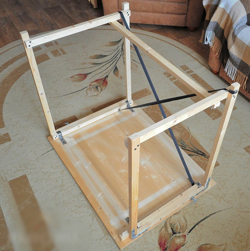 Когда все готово, изготавливают каркас и столешницы под стол. Верхняя часть должна полностью закрываться одним элементом. Вторая же столешница будет спрятана под стол. После тщательных замеров крышка прикручивается к каркасу с помощью специальных трансформирующих механизмов